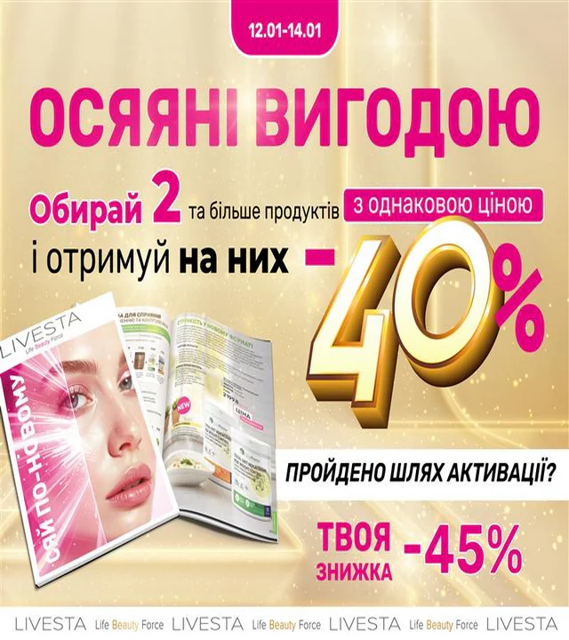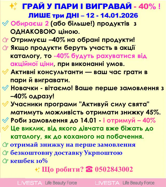 ✔️ Пропозиція для ВСІХ Новачків у Каталозі січень №01 – ЗНИЖКА 30% на перше ЗАМОВЛЕННЯ + Безкоштовна доставка Укрпоштою та Новою поштою першого замовлення з каталогу Livesta.